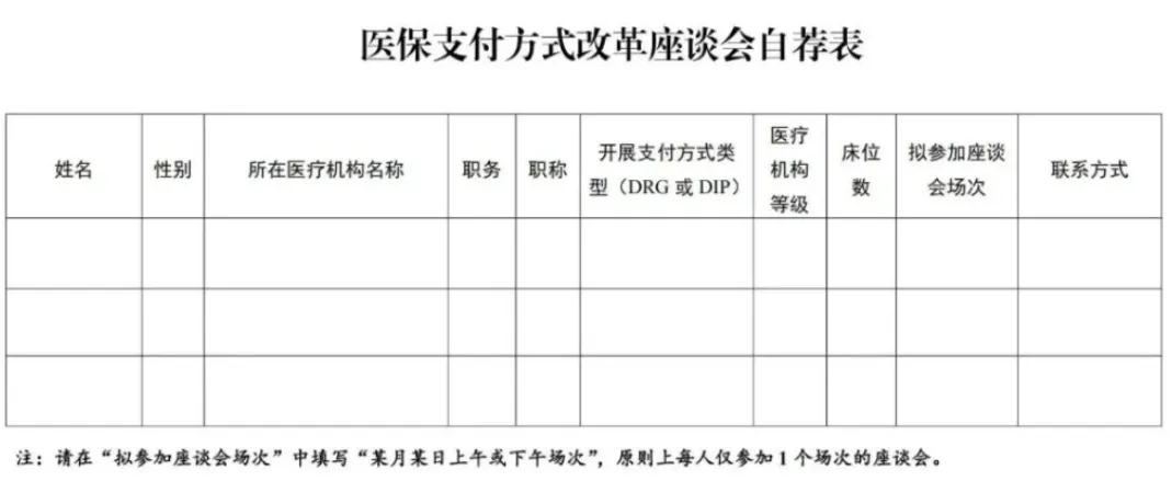 在国家医保局提供的座谈会自荐表,需要报名者写明开展支付方式类型、医疗机构等级、床位数等信息。