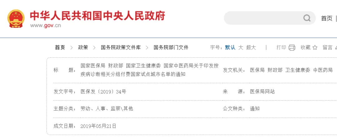 2018年12月,国家医保局下发《关于申报按疾病诊断相关分组付费国家试点的通知》。2019年5月,国家医保局等四部门发布《关于印发按疾病诊断相关分组付费国家试点城市名单的通知》明确,北京市、天津市、上海市等30个城市于2020年起启动模拟测试,2021年启动实际付费。
