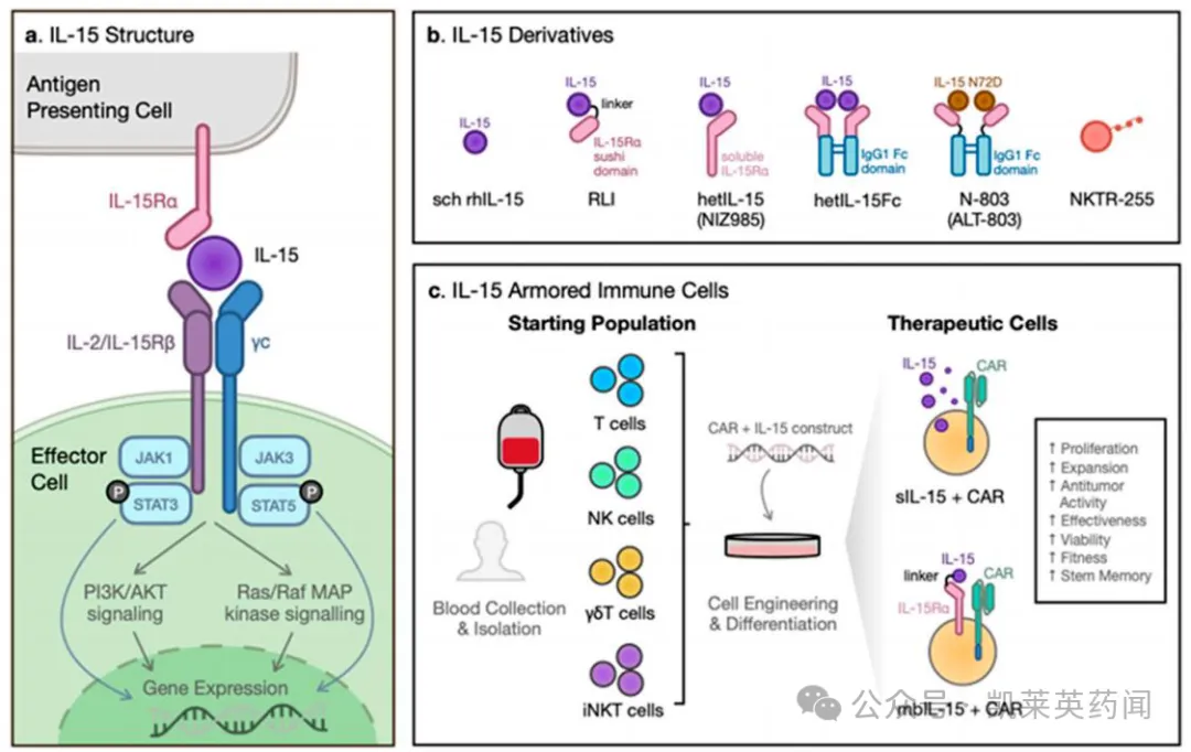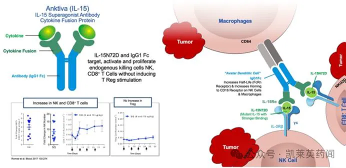 N-803(nogapendekin alfa inbakicept-pmln)是一种白细胞介素-15(IL-15)超激动剂复合物,由IL-15 突变体(IL-15N72D)与IL-15Rαsushi 结构域以及IgG1 Fc 融合蛋白结合而成, IL-15Rα sushi 结构域使得其无需通过像天然IL-15 所必需的反式呈递方式才能激活下游信号通路,且IgG1-Fc 片段极大延长了药物半衰期。