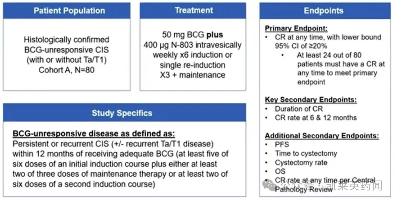 在一项单臂、多中心2期试验中,纳入了77例经尿道切除后伴有或不伴有Ta/T1乳头状病变的BCG无反应的高危NMIBC患者;患者接受N-803诱导,通过膀胱内滴注卡介苗,随后进行维持治疗长达37个月。在长达2年的时间里,每3个月通过膀胱镜检查和尿细胞学检查评估肿瘤状态,并在治疗开始后的前6个月内进行活检(随机或膀胱镜指导)。