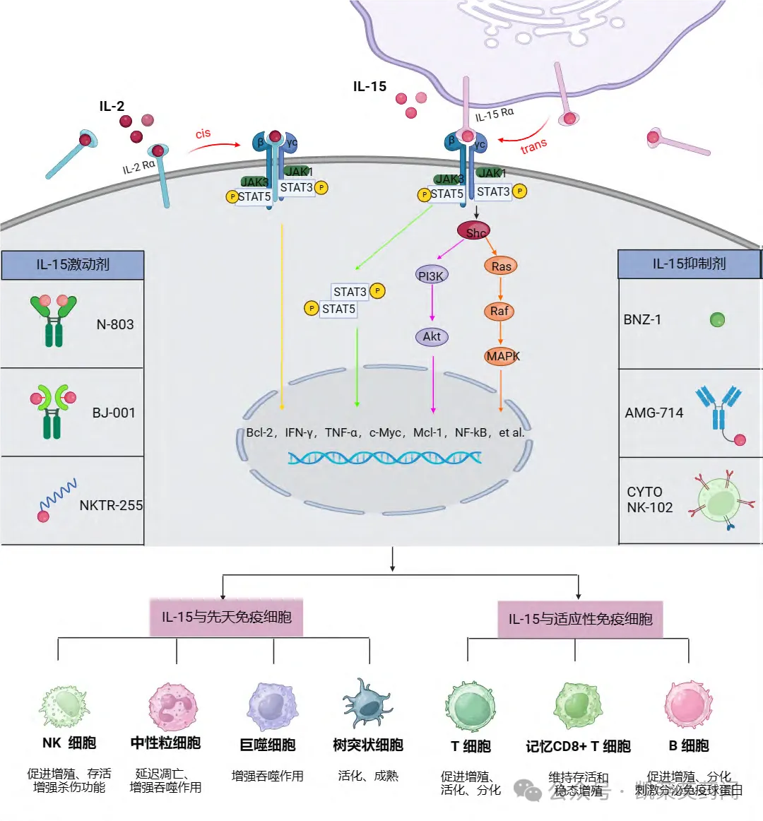 IL-15 主要有两种不同的信号呈递机制,即顺式呈递和反式呈递,在顺式呈递中,IL-15 先与跨膜形式或可溶性形式存在的IL-15Rα 结合,再与IL-15Rβγ 结合。在反式呈递中,IL-15Rα 在IL-15 产生细胞(树突状细胞和巨噬细胞等)的表面表达,将IL-15 反式呈递至携带IL-15Rβ/γc 受体的应答细胞(NK 或记忆CD8+T 细胞等),这可能在协调免疫系统的先天性和适应性分支中起关键作用。