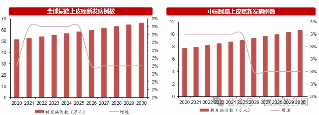 2020年,全球尿路上皮癌病例51.6万人,预计到2025年将达到58.6万人,到2030年预计达到66.3万人。在中国,尿路上皮癌2020年新发病例约7.7万人,预计到2025年将达到9.1万人,到2030年将达到10.6万人。