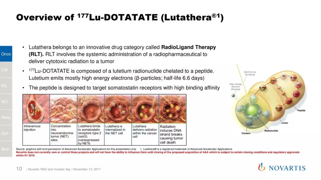 Lutathera是一款放射性配体药物,能结合肿瘤细胞表面的生长抑素受体进入细胞,通过放射性对肿瘤细胞造成损伤。它在2018年获得美国FDA批准治疗经治SSTR阳性的GEP-NET患者,是首款FDA批准的放射性配体疗法。放射性配体疗法通过将放射性同位素的辐射能量递送到肿瘤内部,在杀伤肿瘤的同时减少对健康细胞的影响。这是诺华重点开发的技术平台之一。