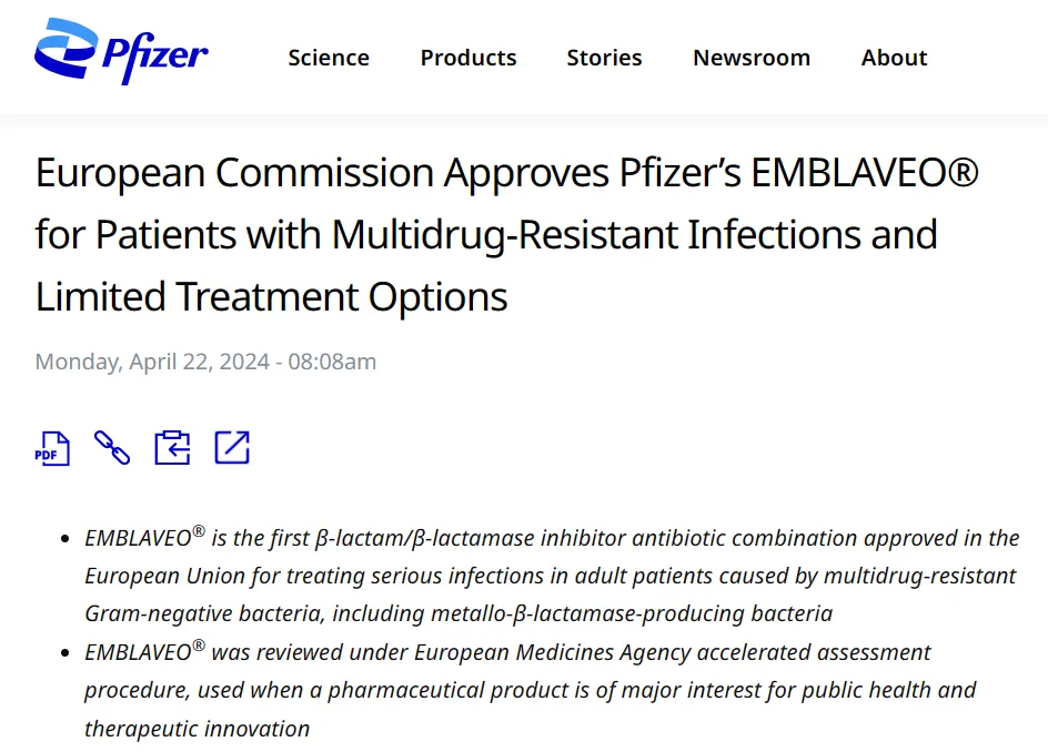 4月22日,辉瑞宣布其抗生素组合疗法Emblaveo(氨曲南+阿维巴坦)在欧盟获批上市,用于治疗复杂性腹腔内感染(cIAI)、包括呼吸机相关性肺炎(VAP)在内的医院获得性肺炎(HAP)和包括肾盂肾炎在内的复杂性尿路感染(cUTI),也适用于需氧革兰氏阴性菌引起的且治疗选择有限的成人细菌感染患者。