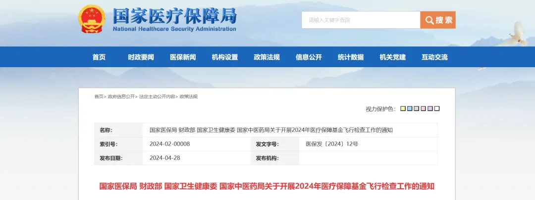 4月28日,国家医保局、财政部、国家卫健委、国家中医药局联合发布《关于开展2024年医疗保障基金飞行检查工作的通知》,覆盖全国所有省(自治区、直辖市及新疆生产建设兵团)以及各类医保基金使用主体的国家飞行检查正式开始。