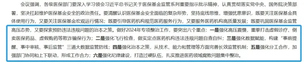 一周之前,国家医保局、最高人民法院、最高人民检察院、公安部、财政部、国家卫健委六部门联合印发《2024年医保基金违法违规问题专项整治工作方案》;4月8日,国家医保局等六部门已经联合召开2024年全国医保基金违法违规问题专项整治工作会议,部署2024年重点工作。