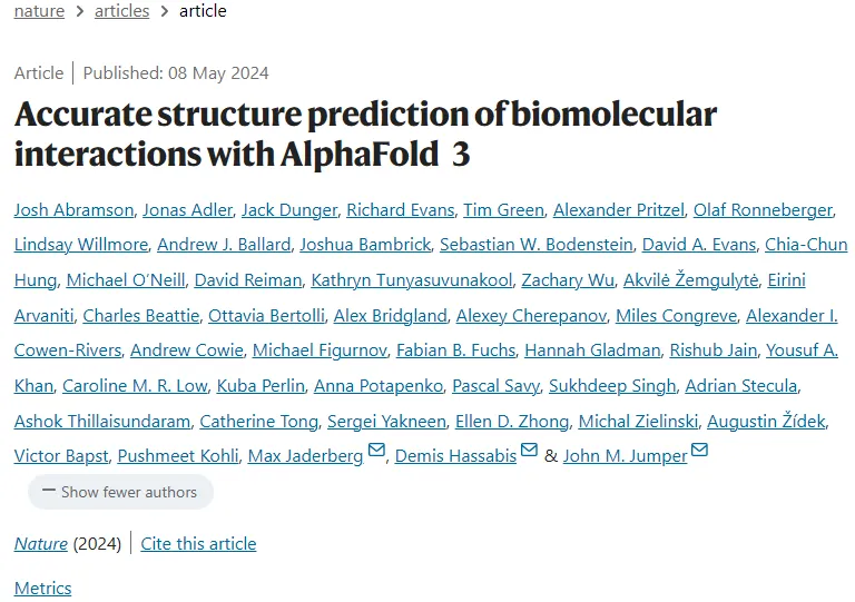 5月8日,Isomorphic Labs与Google DeepMind共同公布了一种采用神经网络架构的生成式AI模型——AlphaFold3,这一发现建立在Google DeepMind开发的、预测蛋白质结构的AlphaFold2的工作基础之上,相关研究成果发表在Nature杂志上。
