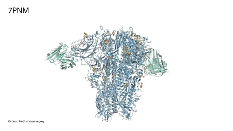图一展示了AlphaFold3对普通感冒病毒(冠状病毒OC43)刺突蛋白(蓝色)与抗体(绿松石色)和单糖(黄色)相互作用时的结构,预测结构与真实结构(灰色)准确吻合。