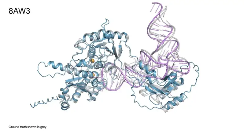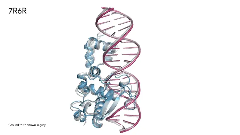 图二展示了AlphaFold3对蛋白质(蓝色)与DNA双螺旋(粉色)结合的分子复合物的预测,与真实分子结构(灰色)几乎完美匹配。