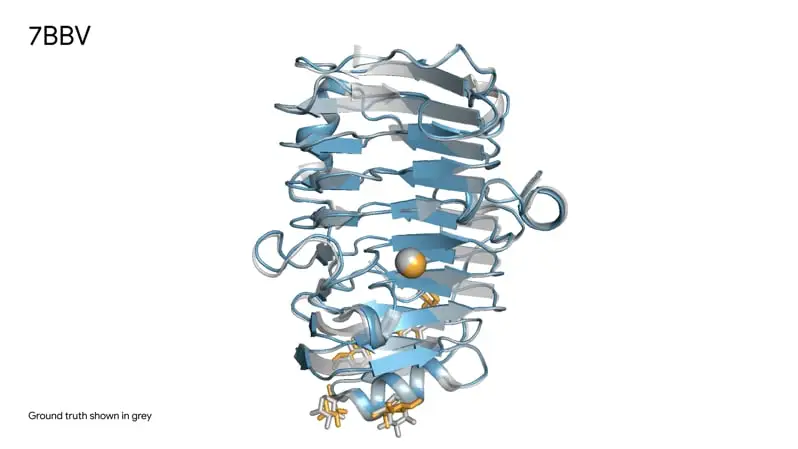 图四展示了AlphaFold3对一种分子复合物的结构预测,该复合物包含一种酶蛋白(蓝色)、离子(黄色球体)和单糖(黄色),预测结果与真实结构(灰色)非常吻合。这种酶存在于一种土壤寄生真菌(大丽轮枝菌)中,会损害多种植物,了解这种酶与植物细胞的相互作用有助于研究人员培育更健康、更具抗性的作物。