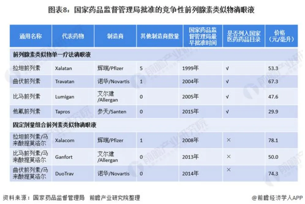 另一个例子则是全球第二大致盲性疾病青光眼领域,该病表现为眼压升高导致的不可逆损伤(视神经受损和视野缺损),目前尚未有治愈的治疗手段,只能通过控制眼内压延缓病情发展。目前青光眼的一线推荐药物为前列腺素类似物滴眼液,同时缺乏有效的创新药物,而前列腺素类药物以老药为主(价格较低),使得青光眼市场规模扩围受限。