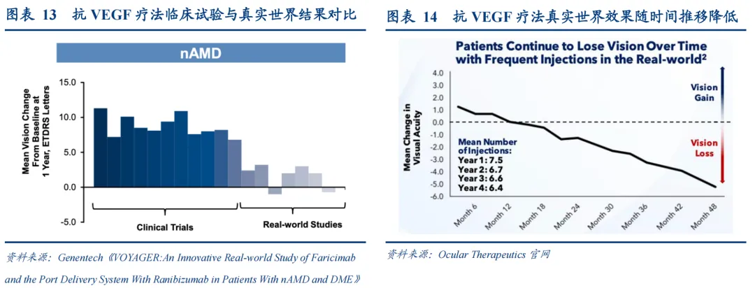 据华创新药研报数据显示,不同抗VEGF药物的多项研究表明,真实世界使用中患者1年的BCVA较基线变化却普遍在-1到3个字母之间,而临床试验BCVA较基线改善可以达到7-11个字母,展现了极大的差异。