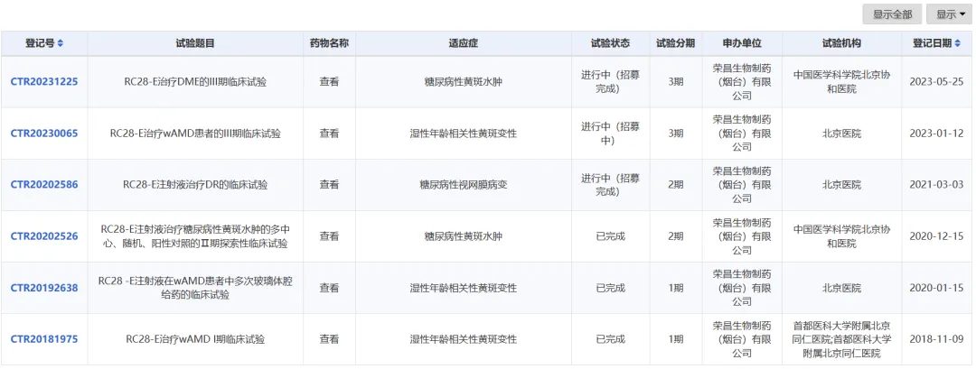 荣昌生物亦是国内眼科生物药的第一梯队竞争者,其双靶标融合蛋白RC28-E也已经进入临床三期,正在推进糖尿病性黄斑水肿、湿性年龄相关性黄斑变性两大适应症。