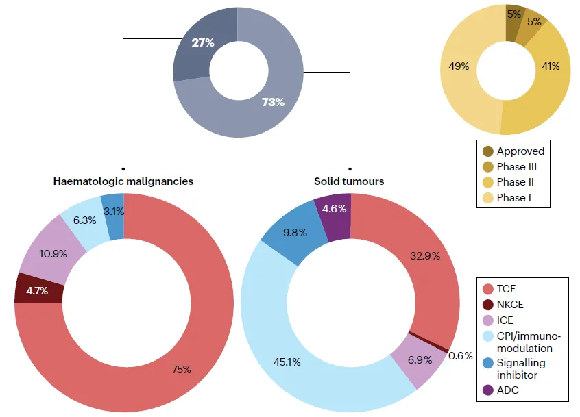 据统计,目前有200多种bsAbs在超过300个临床试验中进行评估,其中约73%的试验针对实体瘤,另外27%旨在治疗血液恶性肿瘤。值得一提的是,目前大约有50%处于临床开发阶段的bsAbs已经进入了后期阶段(2期和3期)或者已经获得批准。从作用机制来看,治疗实体瘤的bsAbs主要为免疫调节剂,其中包括双特异性免疫检查点抑制剂(CPIs,约45%)和双特异性T细胞结合器(约33%),其次是针对双重信号通路的bsAbs、免疫细胞结合器(ICEs)和双特异性抗体偶联药物(ADCs)。而在治疗血液恶性肿瘤方面,双特异性T细胞结合器占主导地位(约75%),其次是ICEs、双CPIs和自然杀伤细胞结合器(NKCEs)。