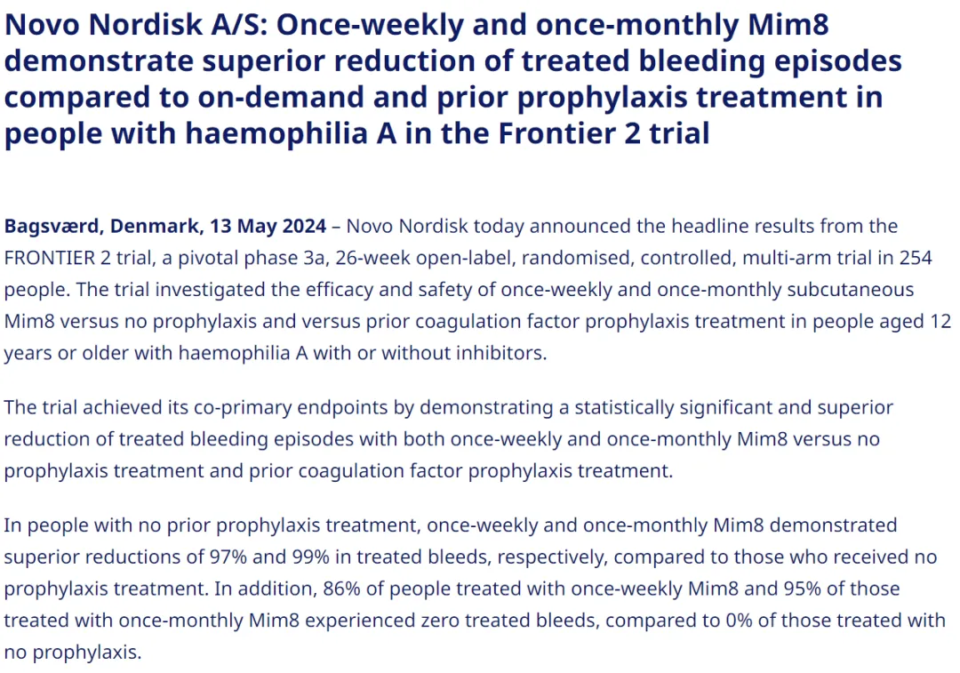 2024年5月13日,诺和诺德公布FIX/FX双抗治疗血友病三期临床FRONTIER 2的最新数据。研究达到主要终点,Mim8治疗组出血事件显著减少,每周一次和每月一次Mim8治疗患者出血事件分别减少97%、99%,两个治疗组分别有86%、95%的患者没有经历出血事件,没有预防治疗的对照组这一比例为0。