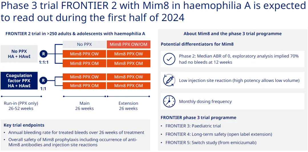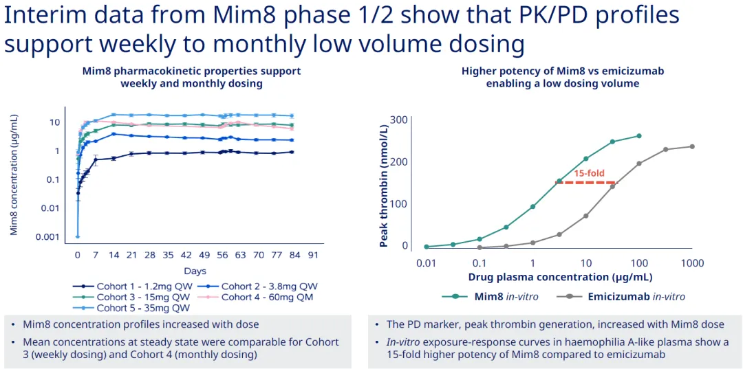 Mim8为一款FIX/FX双抗,相比罗氏的Emicizumab体外活性提高了15倍,PK/PD数据支持每周一次到每月一次给药。