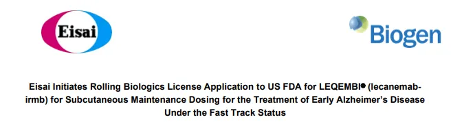今日(2024年5月15日),从卫材官方公布信息可知,卫材已开始向FDA滚动提交用于每周维持剂量的Lecanemab-irmb(商品名:LEQEMBI®)皮下注射剂的生物制品许可申请(BLA)(FDA授予快速通道指定)。LEQEMBI适用于治疗轻度认知障碍(MCI)或轻度痴呆阶段(早期AD)的阿尔茨海默病(AD)患者。
