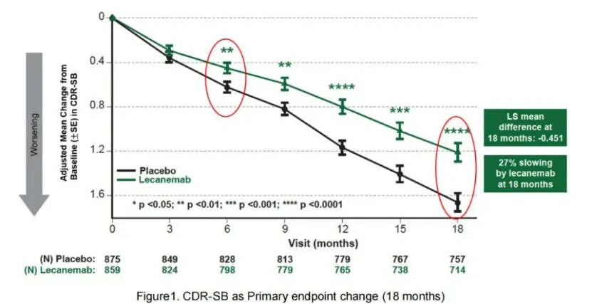 Lecanemab临床III期研究Clarity AD确认了临床获益:Clarity AD III期临床达到了降低CDR-SB评分主要临床终点和所有关键次要临床终点。在治疗18个月之后,在ITT人群中,Lecanemab相比安慰剂降低了27%的CDR-SB评分(降低了0.45分,p=0.00005)。