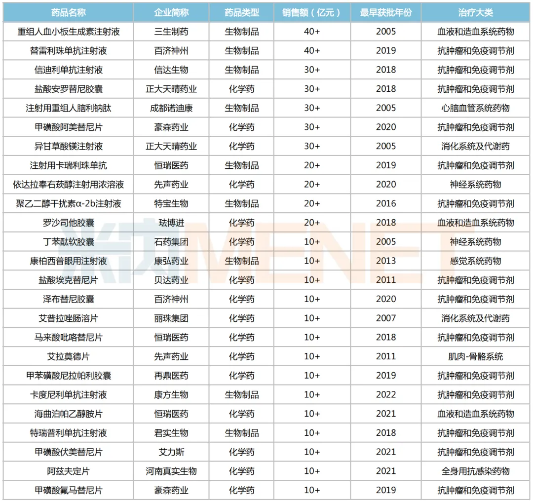 2023年销售额超10亿元的国产1类新药