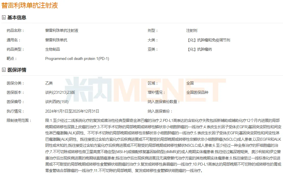 替雷利珠单抗注射液医保准入情况