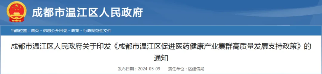 具体来看,成都温江区的政策明确:支持新招引生物医药项目,对用地类重大项目给予固投奖励,对优质的载体类企业给予最长三年租金补贴和最高1000万元装修设备补贴;在加快创新成果转化方面,对创新药单品种给予最高3000万元支持,对制药设备、动物/宠物药、特医保健食品等项目给予最高100万元补贴等。