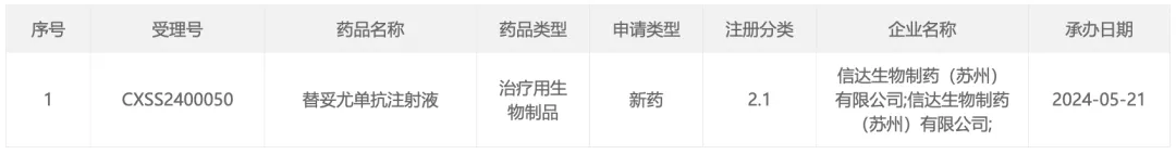 5 月 21 日,信达生物宣布,其在研替妥尤单抗注射液的新药上市申请已获 CDE 受理,用于甲状腺眼病(TED)的治疗。替妥尤单抗(IBI311)是中国首个申报上市的 IGF-1R 抗体。