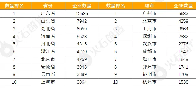 从新增企业地域分布来看,企业数量排名前十的省份广东省、山东省、湖北省、河南省、河北省、浙江省、北京市、安徽省、云南省、上海市,占全国新增企业总量的22.22%。企业数量排名前十的城市为广州市、北京市、上海市、深圳市、武汉市、成都市、海口市、郑州市、昆明市、杭州市,占全国新增企业总量的10.83%。