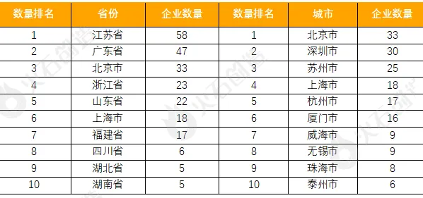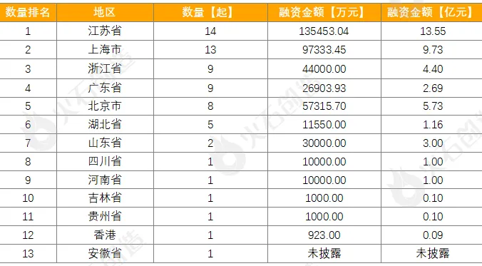 从融资地域看,本月融资项目主要分布在江苏省(14起)和上海市(13起)。从融资金额来看,江苏省最为突出,融资金额高达13.55亿元;其次,上海市也较为突出,融资金额高达9.73亿元。