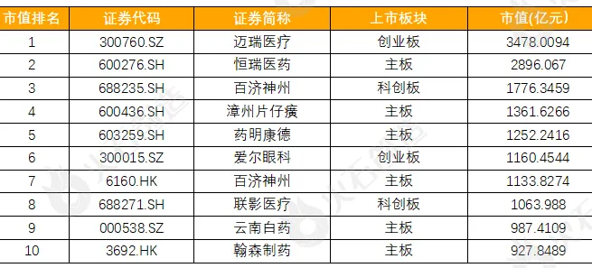 截至2024年4月底,全国共有生物医药上市企业1428家,其中A股生物医药上市企业681家,三板生物医药上市企业480家,港股生物医药上市企业267家。4月份新增上市生物医药企业2家,市场分布为新三板1家,老三板1家。全国上市生物医药企业总市值达9.83万亿元。其中,市值突破千亿元的生物医药上市企业7家,分布在创新药、医疗器械、医疗服务等领域。