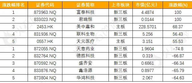 同上月相比,富泰科技、君瑞恒、美中嘉和、联科生物、天元医疗的涨幅较大,其中富泰科技(873963)和君瑞恒(833023)市值涨幅达100%,美中嘉和(02453)市值涨幅达68.37%;天意药业、德胜科技、盛齐安、鑫浩源、华鸿科技的跌幅较大,其中天意药业(872055)市值跌幅达74.8%,德胜科技(832764)市值跌幅达66.87%,盛齐安(870592)市值跌幅达66.34%。