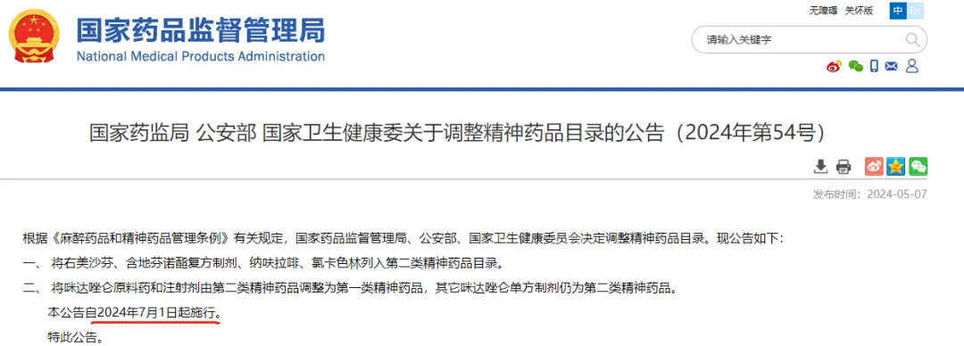 5月7日,国家药监局、公安部、国家卫健委三部门联合发布《关于调整精神药品目录的公告》公告显示,将右美沙芬、含地芬诺酯复方制剂、纳呋拉啡、氯卡色林列入第二类精神药品目录。此外,将咪达唑仑原料药和注射剂由第二类精神药品调整为第一类精神药品,其它咪达唑仑单方制剂仍为第二类精神药品。本公告自2024年7月1日起施行。