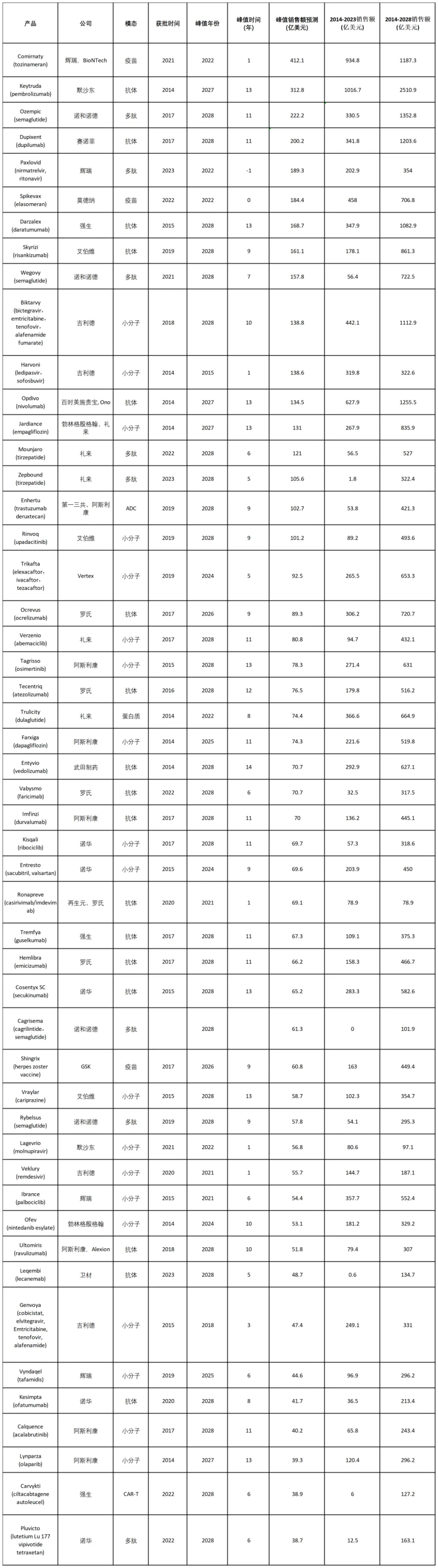 表1. 2014年后上市的超级重磅炸弹