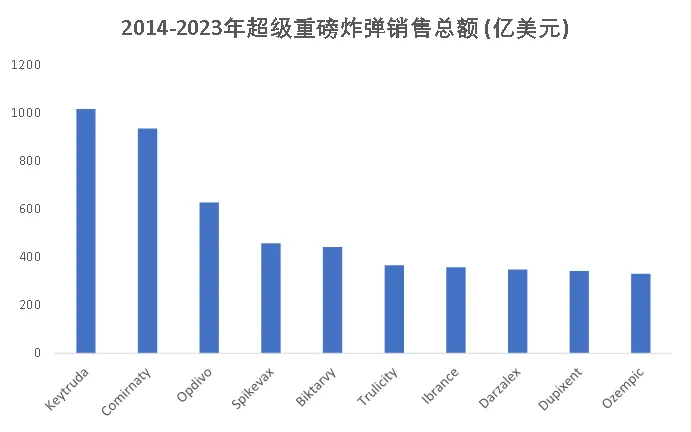 图2. 2014-2023年超级重磅炸弹销售总量前十排名