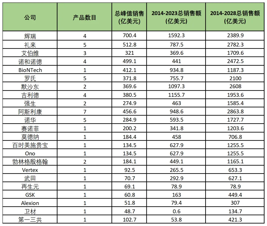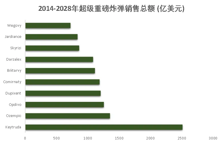图3. 2014-2028年超级重磅炸弹销售总量前十排名