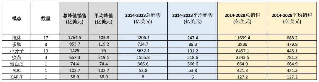 根据Evaluate Pharma预测,在2014年至2023年FDA批准的487种药物中,有193种药物的峰值年销售额将超过10亿美元。这意味着大约39% 的新药将达到重磅炸弹状态。其中销量最大的药品有17种,预计峰值年销售额将超过100亿美元;42种药品预计峰值年销售额将超过50亿美元;114种超过20亿美元。