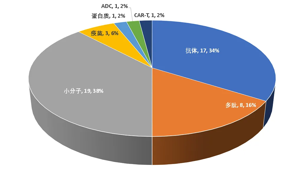 从模态来看,前50名中抗体类的超级重磅炸弹数量最多,达到了17款。其次是小分子(19款)、多肽(8款)和疫苗(3款)。蛋白质、ADC和CAR-T各一款(图6)。这说明了以Keytruda为代表的抗体类药物在几个关键的适应症领域内的广泛应用,包括肿瘤学和炎症及免疫学。多肽产品中,超级重磅炸弹药物几乎全部针对的是2型糖尿病和减肥药市场,其模态优势表现得非常明显,是目前小分子和抗体药物暂时无法与其分庭抗礼的局面