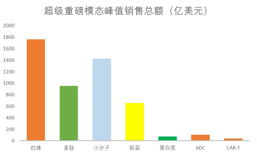 从峰值总销售额来看,抗体因为其庞大的数量毫无疑问地占据榜首,其次是小分子和多肽(图7)。从平均峰值销售额的角度来看,疫苗排在首位,这显然是由Covid-19疫情所决定的。多肽的平均峰值销售排名第二,其次是抗体和ADC(图8)。