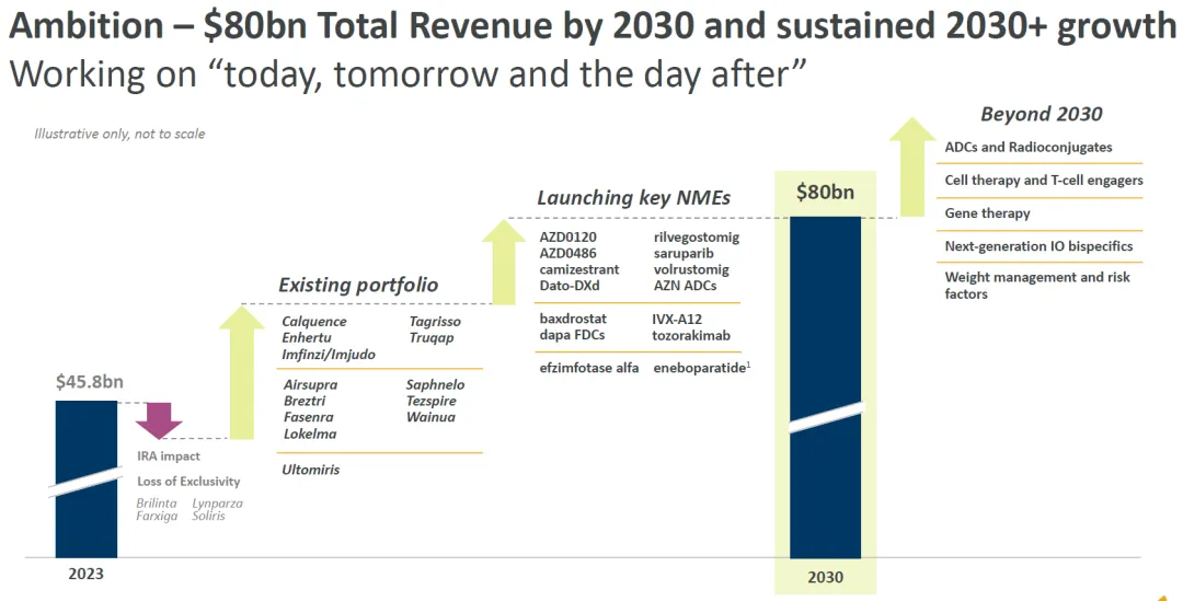 这个增长对于一家大型企业来说并不容易,但是在Pascal Soriot的带领下,阿斯利康早已实现了困境反转,并完美实现了十年前夸下的海口。2023年,阿斯利康的公司总营收为458亿美元。这还不是终点,阿斯利康昨日在投资者日上再次掷下豪言——2030年实现800亿美元的总收入,并在2030年后实现持续增长。