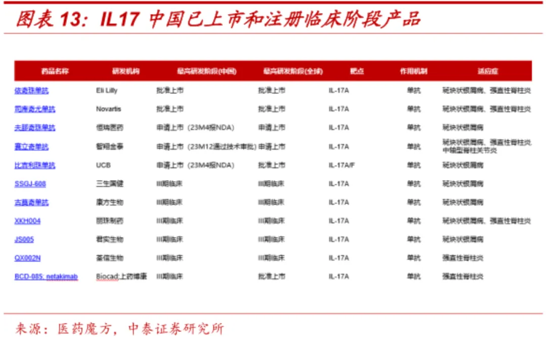 IL-17A作为人体重要的促炎因子,在银屑病、银屑病关节炎和强制性脊柱炎在内的多种自免疾病病程中发挥重要作用;放眼国内,目前礼来的依奇珠单抗和诺华的司库奇尤单抗已经在市,随后近10款相关管线处于报产及三期临床,竞争已进入白热化。