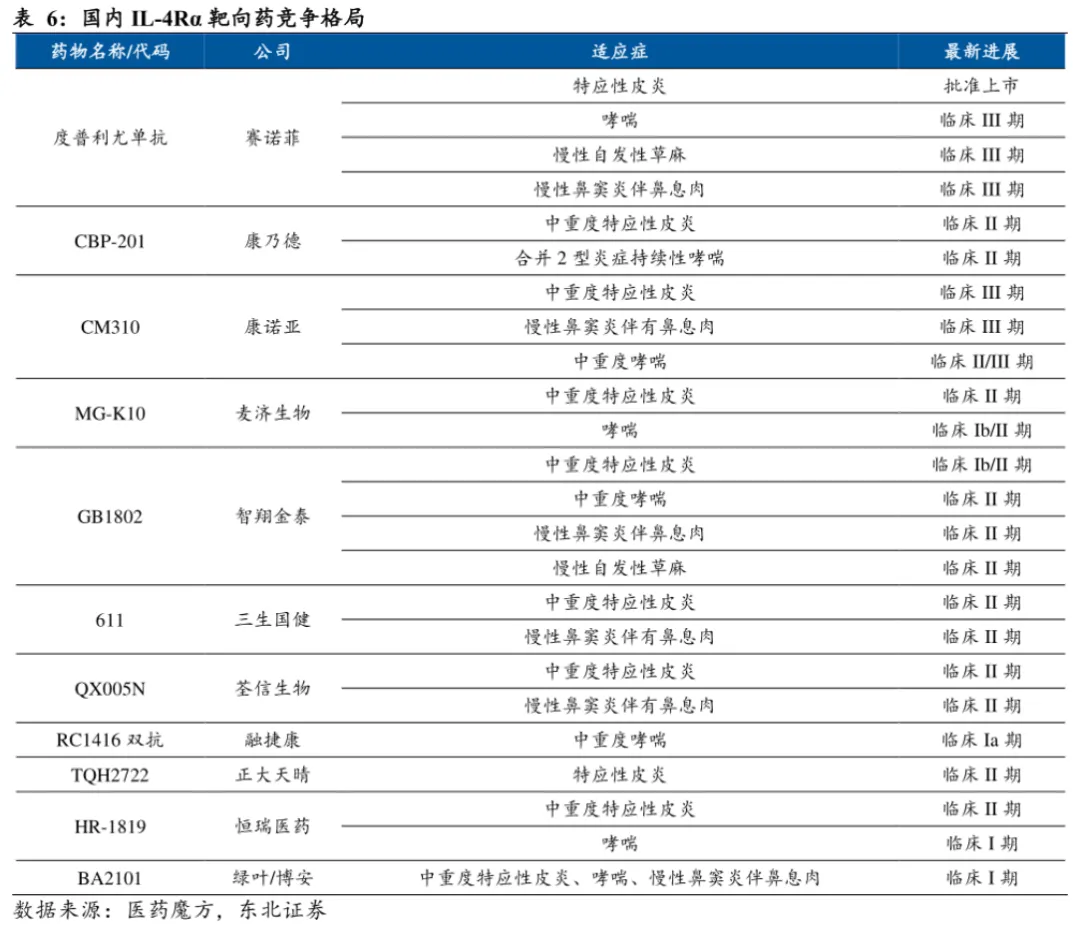 另外一个已被验证的潜力靶点IL-4Rα同样拥挤,已被证明在特应性皮炎、过敏性鼻炎、COPD、哮喘等疾病有优异的疗效。目前,除了赛诺菲的度普利尤单抗称霸外,康诺亚CM310已进入报产阶段,同时还有超过5家公司处于二期临床之后的阶段,竞争相比IL-17缓和,但也不轻松。