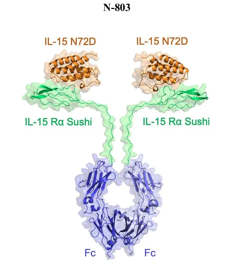N-803是一种IL-15超激动剂复合物,其结构由IL-15突变体、IL-15Rα sushi结构域和IgG1 Fc融合蛋白结合而成。