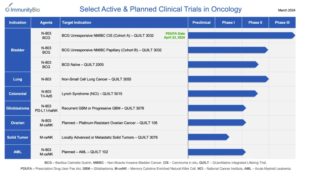 N-803的惊艳数据不止于膀胱癌,从ImmunityBio对其的开发计划看,开发适应症覆盖肺癌、结直肠癌、胶质母细胞瘤、卵巢癌等。