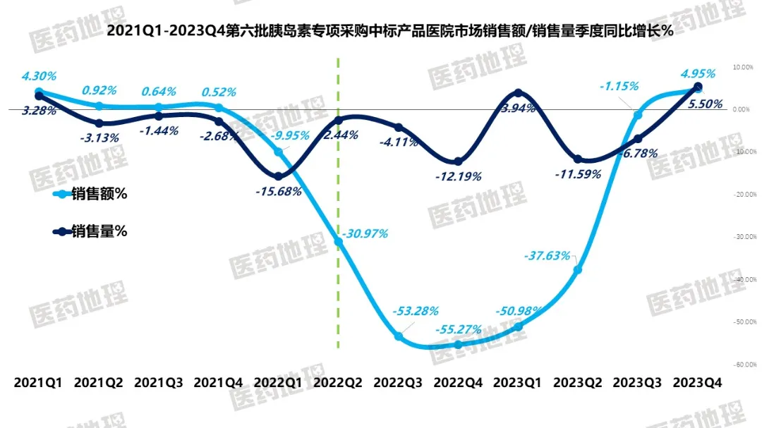 2022年5月,第六批胰岛素专项集采在全国各地陆续落地执行,根据中国医药工业信息中心数据,2022年Q2院内胰岛素市场(仅指第六批胰岛素专项集采中标产品,下同)销售量同比增长2.44%,销售额同比下降30.97%;直至2023年Q4,院内胰岛素市场销售量同比增长4.95%,销售额同比增长5.5%。