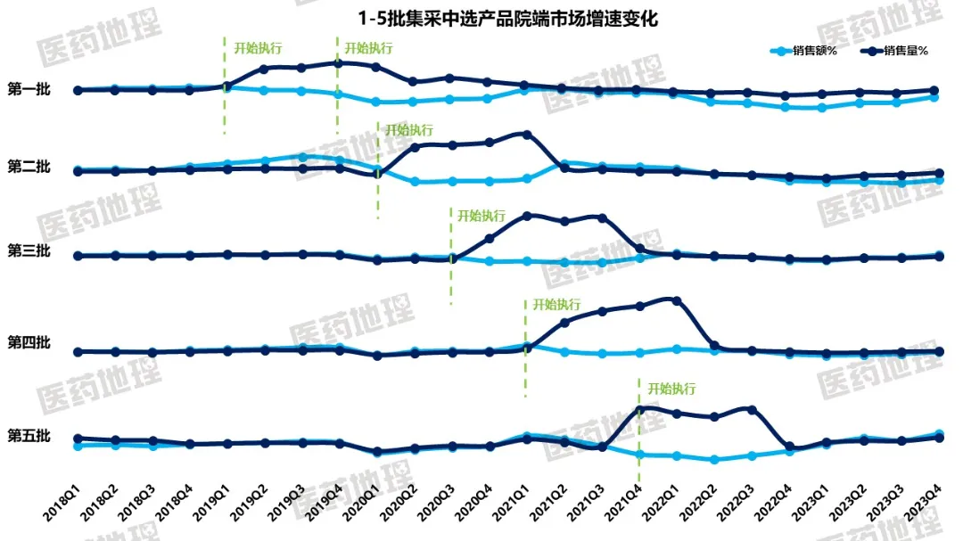 图2:2018Q1-2023Q4第一批~第五批集采中标产品医院市场销售额/销售量季度同比增速变化% 数据来源:PDB药物综合数据库-样本医院市场数据,中国医药工业信息中心