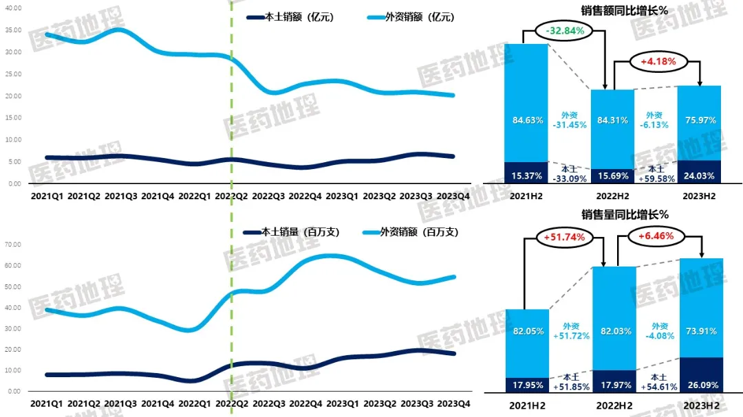 在中选药品价格变动的影响下,2022H2院内胰岛素市场销售额规模同比下降了32.84%(2022H2 vs 2021H2销售额同比增长%),且外资和本土药企销售额降幅均较大;执行第二年后,院内胰岛素市场销售额增长趋势有所上升,同比增长了4.18%(2023H2 vs 2022H2销售额同比增长%),此期间主要以本土药企销售额同比增长贡献为主,外资药企销售额下降幅度有所减小。