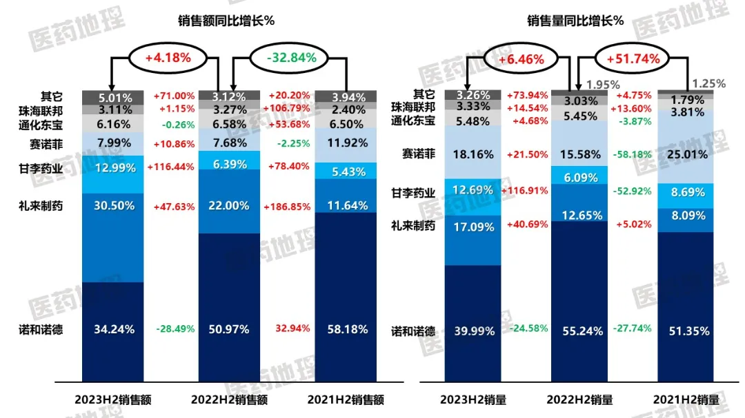 从第六批集采中标企业院内市场销售表现来看,尽管诺和诺德在销售额和销售量占比上都居于首位,然后诺和诺德的销售额占比在执行后,2022H2和2023H2都有大幅下降。礼来制药、甘李药业、赛诺菲、通化东宝、销售额占比都有所上涨,且礼来制药、甘李药业、赛诺菲在执行第二年后的销售量同比也有显著提升。第六批集采的市场格局洗牌影响持续,本土药企和外资药企的价格体系被重新定义。