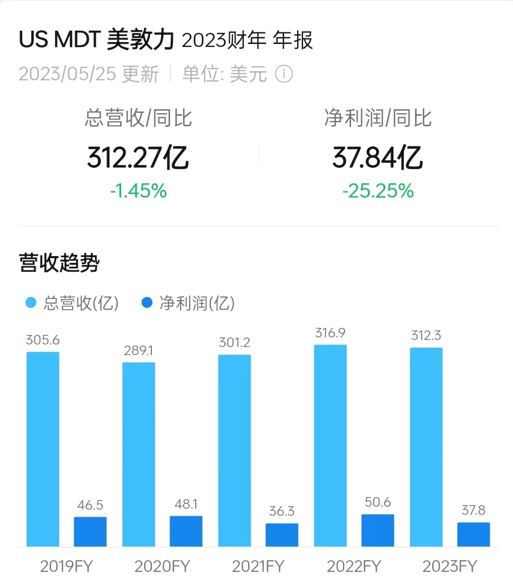 美敦力2023财年全年营收312.27亿美元,同比下降1.4%;研发支出26.96亿美元,同比下降1.8%;净利润37.58亿美元,同比下降25.4%。