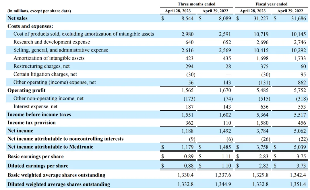 2023年5月25日,美敦力发布2023财年全年和第四季度财报(美敦力2023财年区间为2022年4月30日-2023年4月28日)。