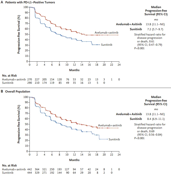 该研究的PFS终点已于2019年达到。在总体人群中,阿维鲁单抗联合阿昔替尼组患者的PFS相比舒尼替尼组显著延长(13.8 vs. 8.4个月,HR=0.69,P<0.001);在PD-L1+人群中,阿维鲁单抗联合阿昔替尼组患者的PFS相比舒尼替尼组亦显著延长(13.8 vs. 7.2个月,HR=0.61,P<0.001)。