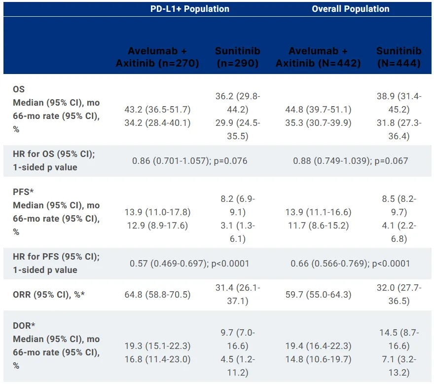 该研究是一项多中心、随机、开放标签临床试验(n=886),评估了阿维鲁单抗联合阿昔替尼对比舒尼替尼一线治疗晚期肾细胞癌患者的疗效和安全性。研究的主要终点为无进展生存期(PFS)和OS。